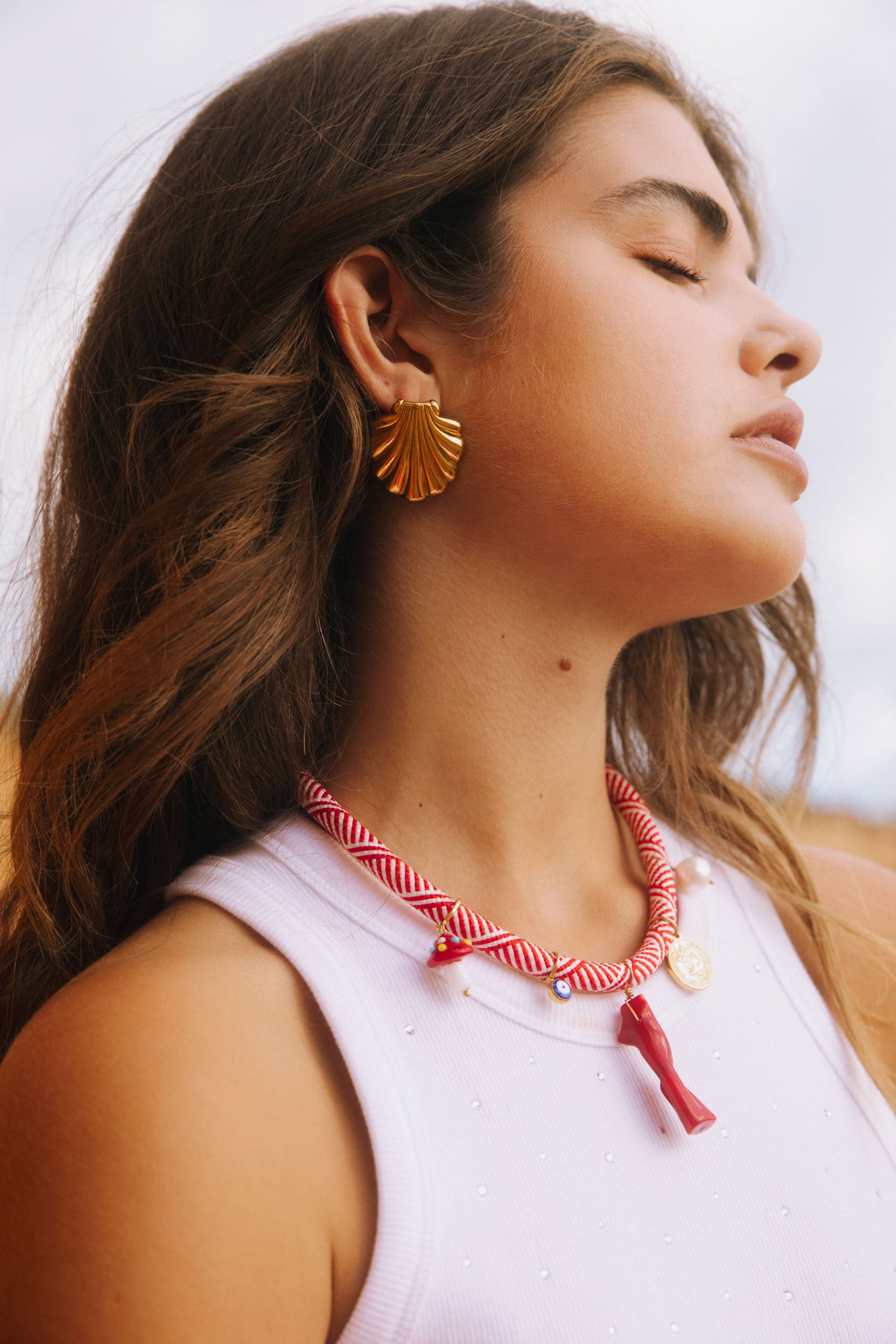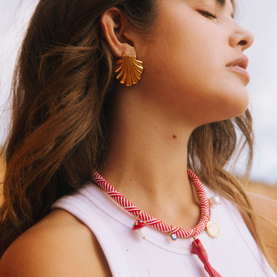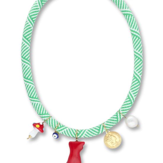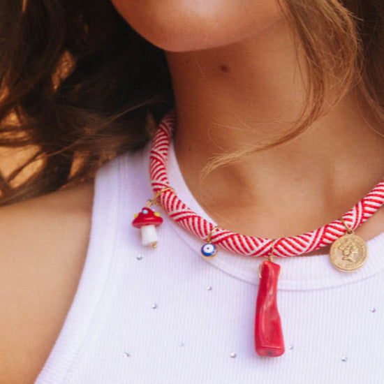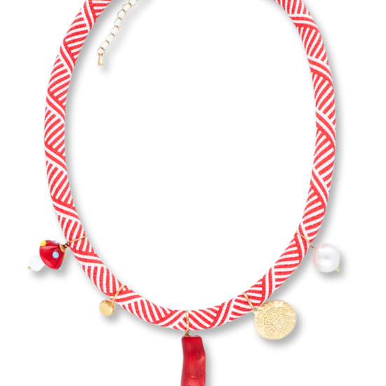 One of our stunning pieces! Rope necklace with playful pendants including coral and pearls.