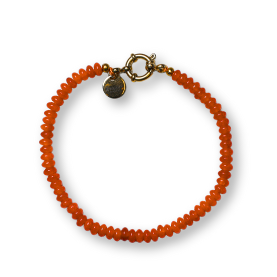 This elegant bracelet is handcrafted with vibrant orange jade gemstone beads, adding a touch of warmth to your everyday look. Finished with a 14K gold-plated stainless steel clasp for a refined finish.