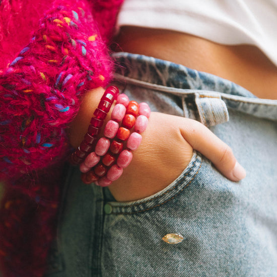 This bold and playful bracelet is handcrafted with burgundy acrylic cube beads, creating a vibrant and modern look. Finished with a 14K gold-plated stainless steel clasp for a touch of elegance.