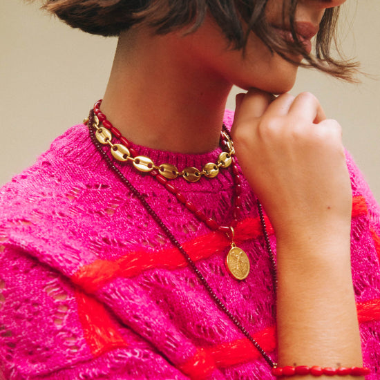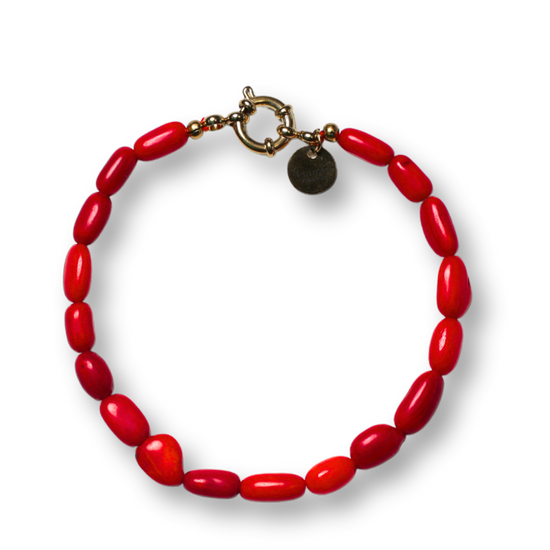 This timeless bracelet is crafted with natural red coral beads, bringing warmth and character. Finished with a 14K gold-plated stainless steel clasp for an elegant finish.