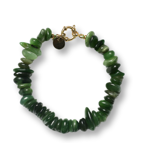 This bold and grounding bracelet is made with natural green agate beads, showcasing an organic texture and earthy elegance. The irregular shapes of each bead create a unique and expressive look. Finished with a 14K gold-plated stainless steel clasp for a refined accent.